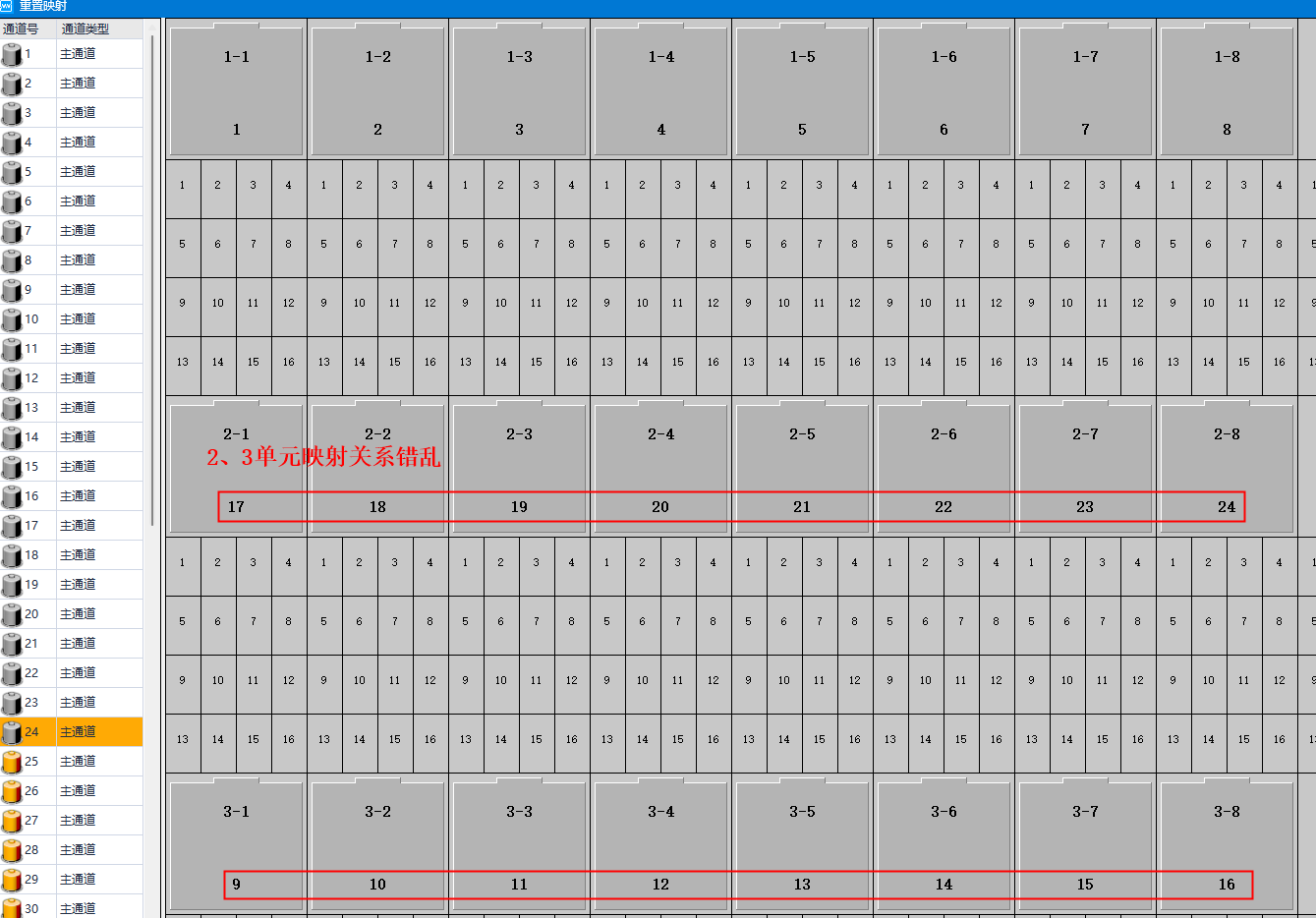 设备通道映射关系错乱,例如:在软件上启动第二排通道,但是实际亮灯的是第三排通道的指示灯。