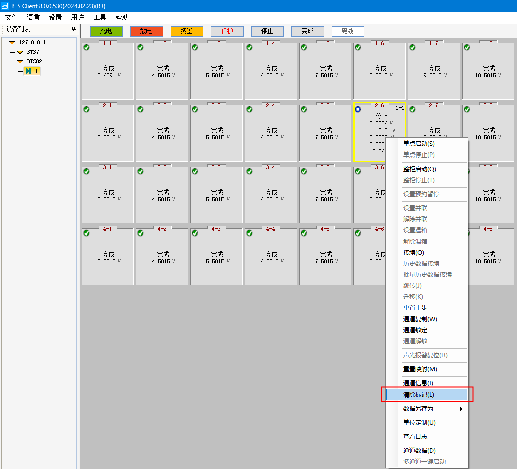 若出现个别通道无法撤回(显示灰色),则需要返回主页面,右键修改“清除标记”修改通道状态为“完成”。