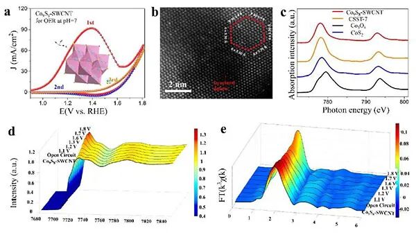 图4 Co9S8-SWCNT在中性电解液(pH=7)中的OER性能:(a) 前三次的CV图;Co9S8-SWCNT在OER催化过程之后的(b) HRTEM;(c) Co L边XANES图;(d, e) 原位XAFS观测到的结构自优化过程。
