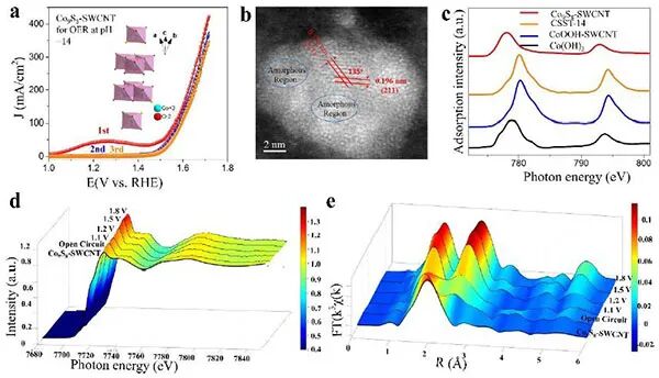 图3 Co9S8-SWCNT在碱性电解液(pH=14)中的OER性能:(a) 前三次的CV图;Co9S8-SWCNT在OER催化过程之后的(b) HRTEM;(c) Co L边XANES图;(d, e) 原位XAFS观测到的结构自优化过程。