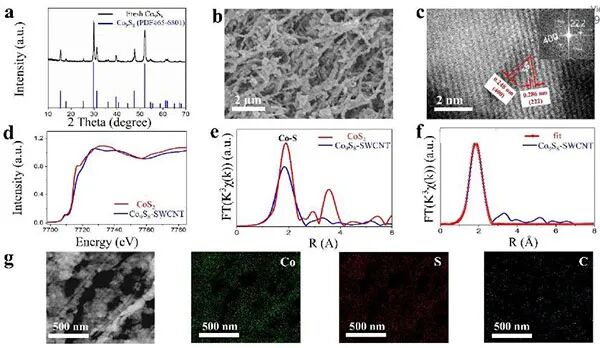 作者也利用X射线吸收近边结构(XANES)研究了Co9S8-SWCNT的局域电子和几何结构:其Co K边吸收谱与CoS2的相近,表明Co9S8-SWCNT具有与CoS2相似的结构。接着利用扩展X射线吸收精细结构(EXAFS)研究其配位结构,如图1e所示,其傅里叶变换的EXAFS中只有一个在1.85 Å处的峰,对应于CoS2中的Co-S键;EXAFS的拟合结果也证实了其具有Co9S8结构(图1f)。
