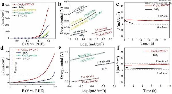 作者分别测试了Co9S8-SWCNT在碱/中性电解液中的OER性能。如图2a所示,Co9S8-SWCNT在碱性电解液(1 M KOH)中在10 mA/cm2和100 mA/cm2电流密度下的过电位分别为150 mV和370 mV,均低于CoOOH-SWCNT, Co9S8粉末和SWCNT相同条件下的过电位。如图2b所示,Co9S8-SWCNT在碱性电解液中的Tafel斜率仅为54 mV/dec,低于IrO2(63 mV/dec)和CoOOH-SWCNT(127mV/dec)的Tafel斜率。这些结果均表明Co9S8-SWCNT具有更适宜的反应动力学及工业应用前景。图2c的计时电流曲线表明在30 h的连续测试过程中Co9S8-SWCNT的催化活性几乎没有下降。
