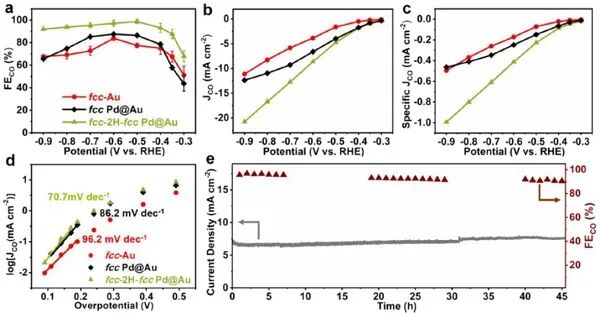 将合成的fcc-2H-fcc Pd@Au纳米棒(图2)用作CO2RR电催化剂。作为对比,fcc-Au纳米棒、fcc Pd@Au纳米颗粒和2H-Pd纳米颗粒也进行了电催化CO2RR测试。如图5a所示,fcc-2H-fcc Pd@Au纳米棒的CO 的法拉第效率在极宽的工作电势范围内(-0.4 V到-0.9 V(vs RHE)均超过90%。在−0.5 V(vs RHE)时,获得最高的CO 法拉第效率约为98.7%,这表明竞争性的析氢反应受到抑制。fcc-Au纳米棒、fcc Pd@Au纳米颗粒和2H-Pd纳米颗粒催化CO生成的最高法拉第效率分别为83.8%,87.5%和67.3%,表明fcc-2H-fcc Pd@Au的催化性能最优越。fcc-2H-fcc Pd@Au纳米棒在整个电势范围内均表现出最高的CO分电流密度(JCO)(图5b)。通过将催化剂的电流密度对电化学活性表面积(ECSA)进行归一化,可以获得特定的CO电流密度(特定的JCO)。如图5c所示,与fcc Pd@Au纳米颗粒和fcc-Au纳米棒相比,fcc-2H-fcc Pd@Au纳米棒表现出明显更高的JCO,表明相比较于传统的fcc纳米材料,异相核-壳纳米结构表现出更好的固有催化活性。